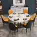 This Modern Sintered Stone Dining Set is more than just a piece of furniture; it's a statement of style and elegance. The combination of a pristine white tabletop with a luxurious gold pedestal base creates a striking contrast that is both modern and timeless. The ergonomic design of the chairs, with their comfortable black and orange cushions, ensures that every meal is a delightful experience.